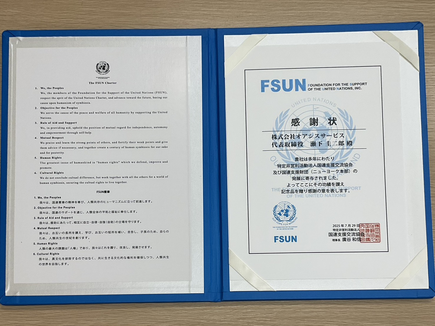 「特定非営利活動法人 国連支援交流協会(FSUN)」様より感謝状をいただきました いつもカメシタをご利用いただき、誠にありがとうございます。 このたび当社は、特定非営利活動法人 国連支援交流協会(FSUN) …