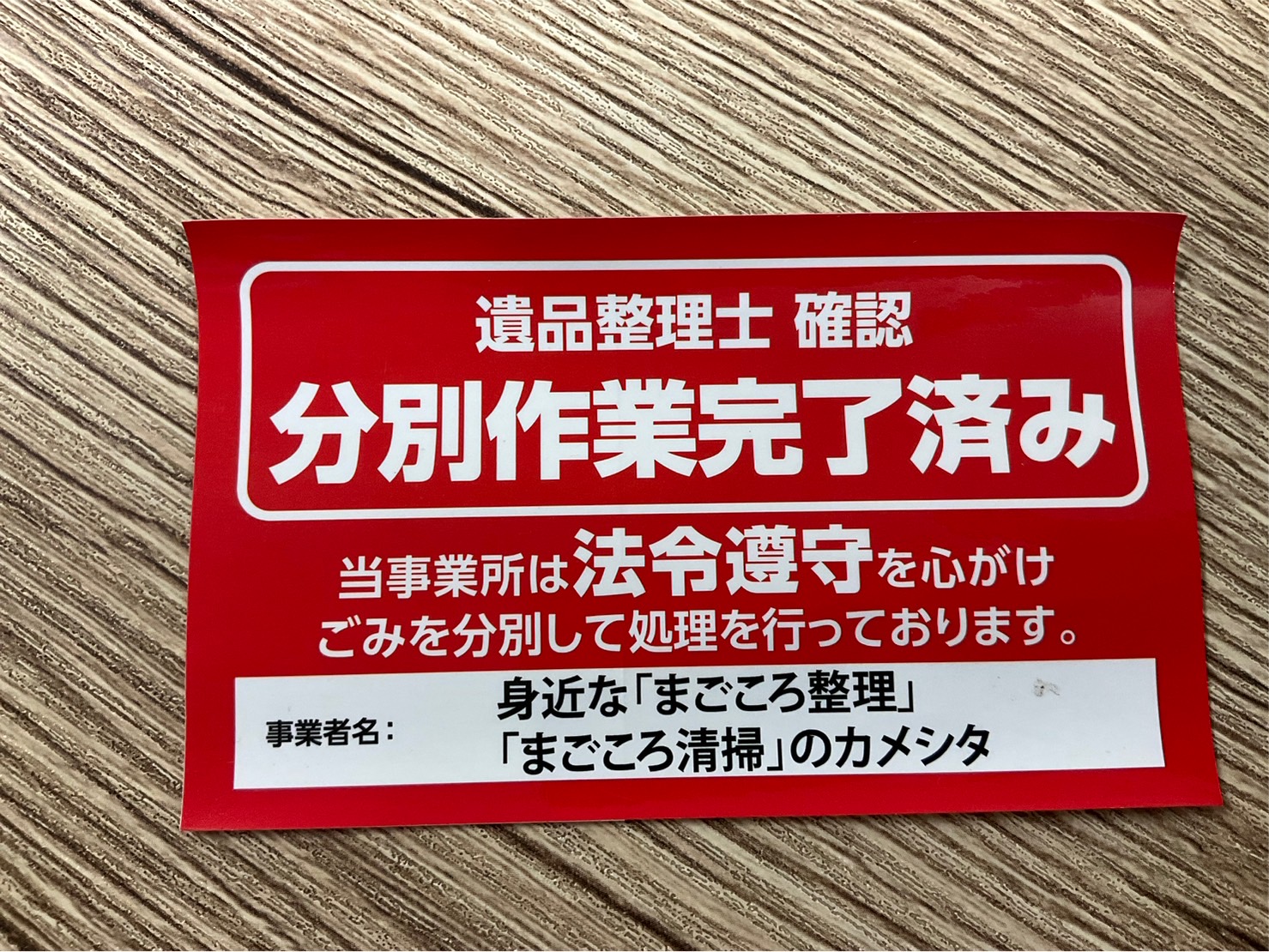 一般財団 遺品整理士認定協会から 一般財団 遺品整理士認定協会から 「全国共通法令遵守遺品整理業者識別シール」ですが 愛知県名古屋市の『身近な「まごころ整理」「まごころ清掃」のカメシタ』様より使用時のお写真 …